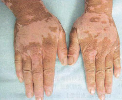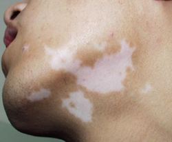 2、散发型白斑:指白斑呈散在性、多发性,往往对称分布,其总面积不超过体表面积的50%。