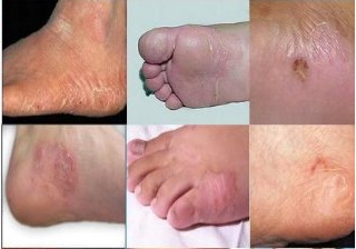 3、角化过度型常见于足根、足跖及其侧缘.角质层增厚、粗糙、脱屑、干燥.自觉症状轻微.每到冬季,易发生皲裂.本型常发生于病期较长、年龄较长患者.