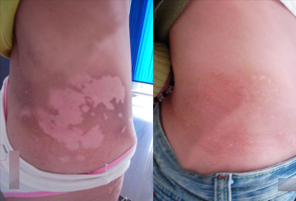 治疗取得良好效果,腰部的白癜风已经基本被黑色素覆盖,腰部皮肤已经恢复了原本的肤色。
