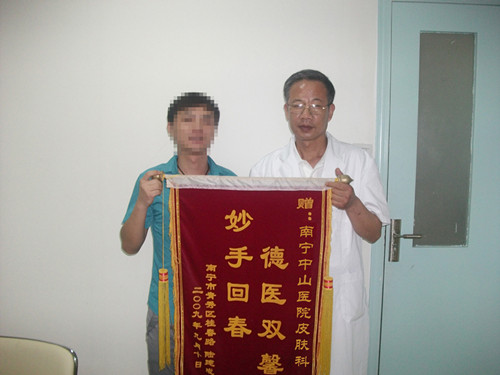 李主任接诊后精心为高先生治疗,“用我们南宁肤康医院的特色治疗--中药浸泡(药浴)和熏蒸,治疗第二天她就不痒了,然后再一个星期来一次。现在红色丘疹没了,炎症消退了,有点色素沉着,现在是恢复期,过一段时间就会退了。”