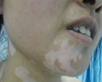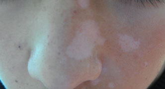 白斑无固定好发部位,色泽时暗时明,常随情绪波动而加重;伴胸闷暖气,性情急躁,两胁胀痛,月经不调,乳胀结块。