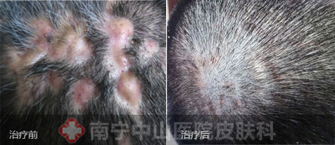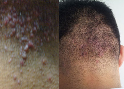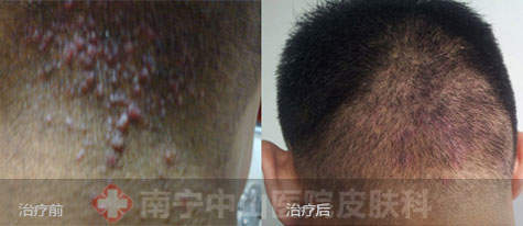 治疗前:小李平时最喜欢打篮球了,前几天打完篮球后,小李发觉头上的那几个"疙瘩"特别痒,摸上去也比之前的要大了很多,母亲仔细一看吓了 一大跳,疙瘩已经全部化脓发炎,整个头皮都红肿不堪。带儿子来到南宁肤康医院。