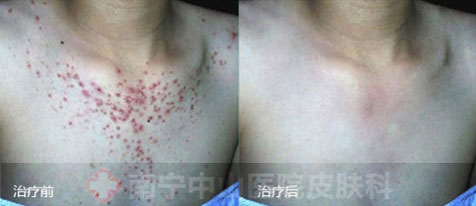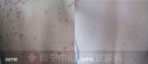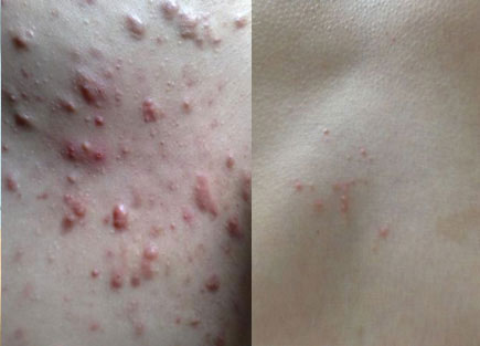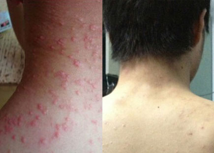 治疗效果:梁主任治疗一次之后,红色丘疹脓包慢慢萎缩消失,破损的疹包开始愈合,瘙痒明显减轻,皮损部位转变为正常皮肤。三周后未见复发。