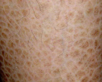 2、皮肤乾燥粗厚,上覆大而深棕色鳞屑,冬重夏轻。随年龄增长,损害不变,甚至加剧;