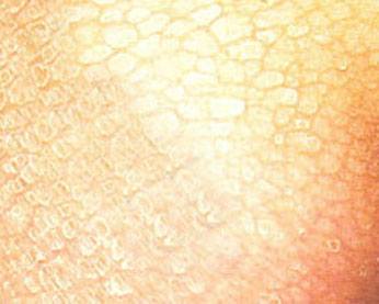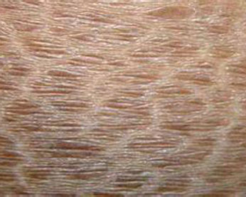 2、皮肤干燥、上覆灰白色至淡棕色菱形或多角形鳞屑,周边翘起,中央紧贴皮肤