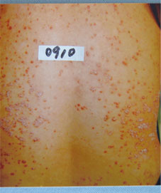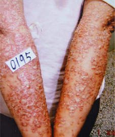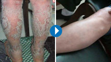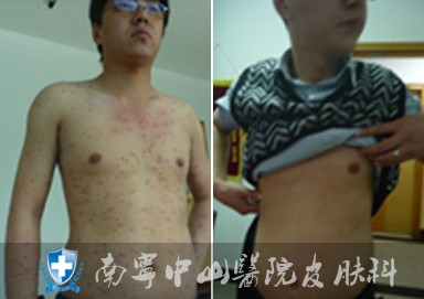 - 【患者概况】天天,14岁,家住云南。患者1年前开始反复出现全身红斑、鳞屑,伴瘙痒。近一个月出现全身大面积脓疱,伴脱皮、瘙痒,全身疼痛。