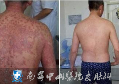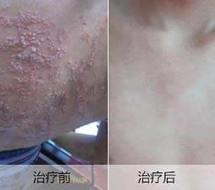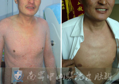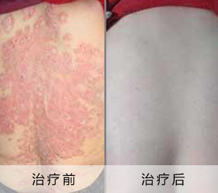 【治疗效果】该患者如今全身患部皮损均已得到很好修复,红斑皮屑均已消退,皮肤光滑,自感舒适。除饮食须忌口外,该患者仍需继续治疗一段时间,巩固疗效