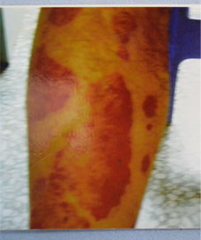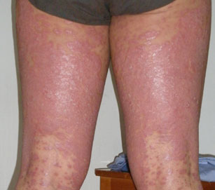- 初起时在原有银屑病皮损部位出现潮红,迅速扩展成大片,最后全身皮肤2/3以上呈弥漫性潮红浸润,肿胀,伴有大量糠状鳞屑。