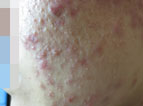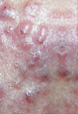 谷粒至绿豆大小。毛囊和丘疹顶端形成脓包,破后脓液粘稠,愈后遗留瘢痕。