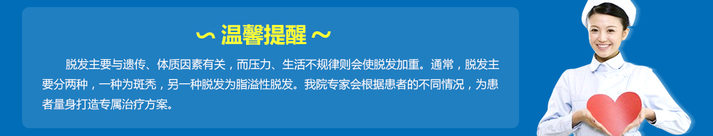 脱发预示着毛囊处于亚健康且宜引起多种并发症,应及时去正规医院检查控制病情,以免加大了后期的治疗周期和不必要的治疗费用。